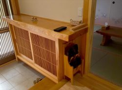 玄関やトイレ、リビングの天井には、伝統の格天井(ごうてんじょう)を採用しています。(画像上)下駄箱も厚みのある天板を使用。(下画像)