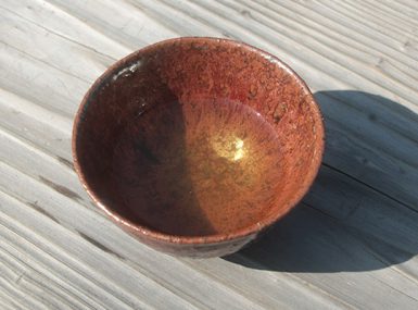 わけても器に茶を汲めば金色に、酒を注げば銀に輝く、世に幻といわれた夕日焼色の、なんという目に鮮やか。