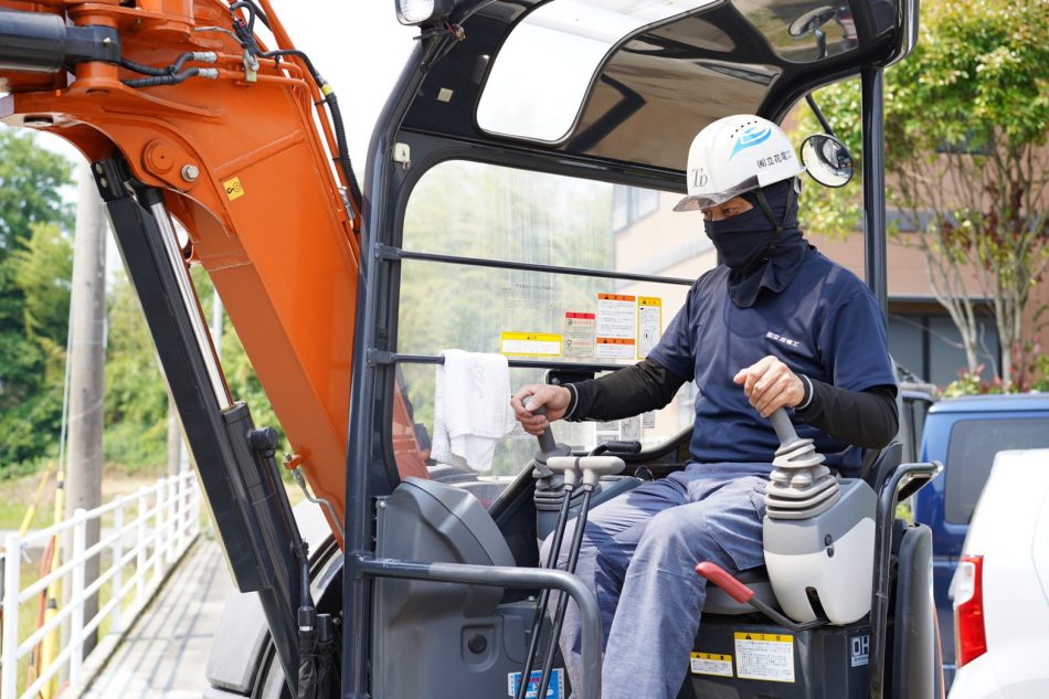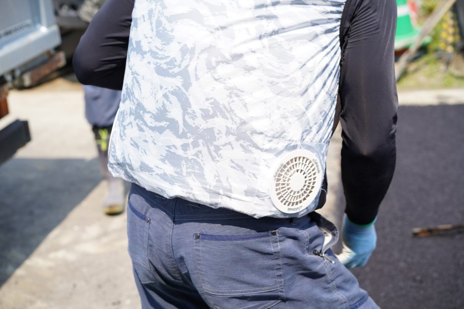 夏場に屋外で作業をする時は、空調服などで熱中症対策をし、適宜に休憩を入れ、無理のないようにすすめます。