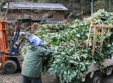 原料の杉の葉を地元の山林より調達するところからはじまります。