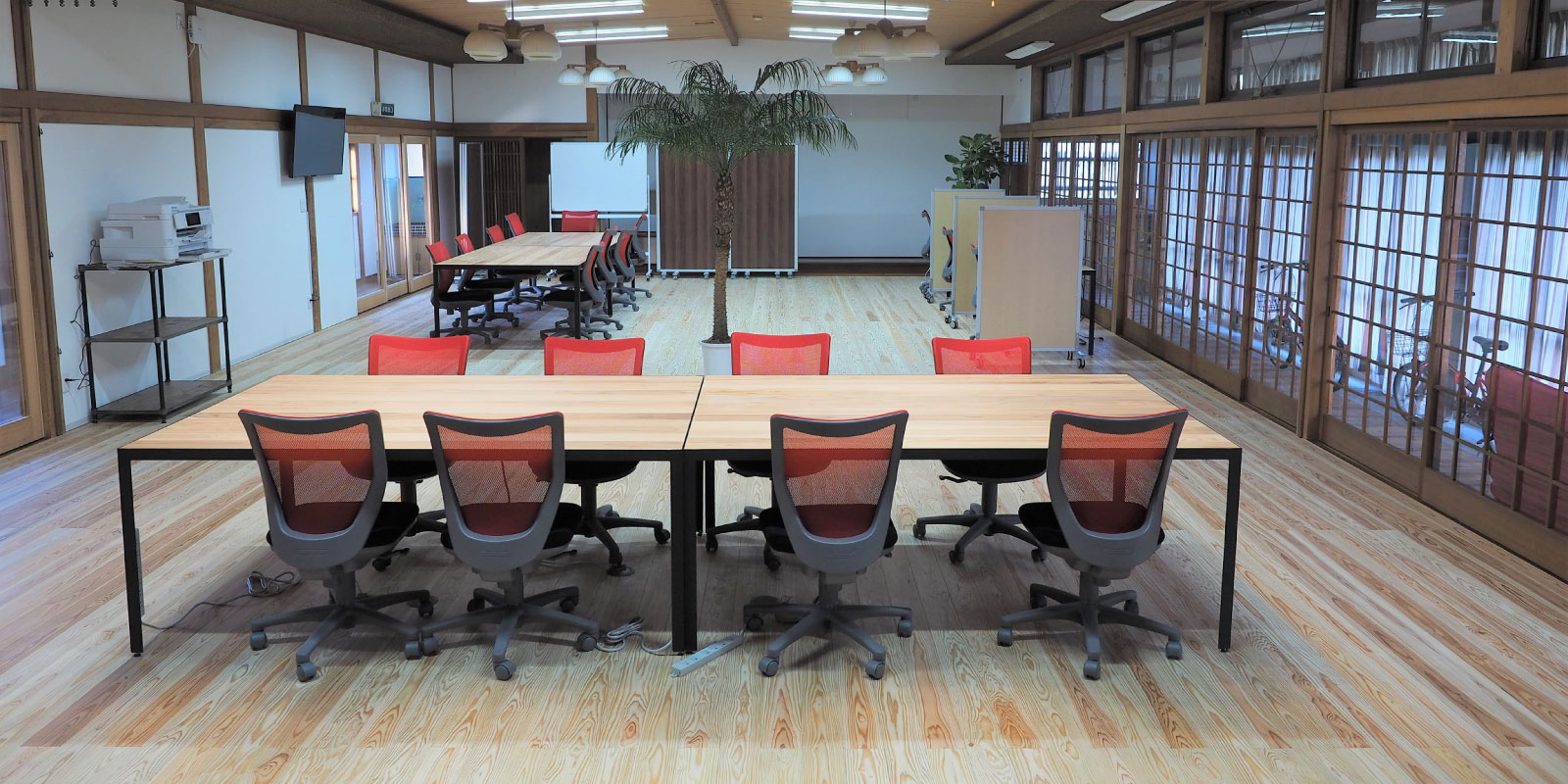 馬場建設さんは、八女市黒木町にあるサテライトオフィス『南仙荘』をもともとの宴会場スペースからオフィスのようにリフォームされております。