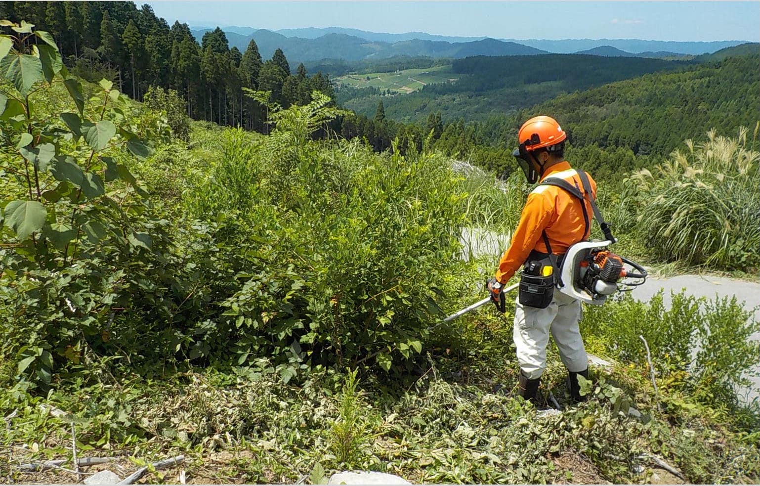 植栽する場所は光が十分に当たる場所を選ぶため、それ以外の植物(雑草)も繁茂します。植栽した木の周りに生えてくるこの草木に栄養を取られないように刈ってあげる作業です。苗がある程度大きくなるまで、杉の場合で約7年間この作業を続けます。
